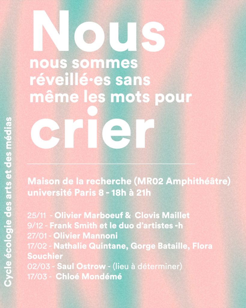 En 2012, sur une tente placée devant l’entrée principale de la dOCUMENTA 13, les mots de l’artiste franco-danois Thierry Geoffroy résonnent jusqu’à aujourd’hui : « The emergency will replace the contemporary », l’urgence remplacera le contemporain. Ce cycle de conférences et de rencontres cherche à contribuer à un art de l’urgence, un art en capacité de répondre à cet obscurantisme et cette guerre contre la/les Sciences, le vivant, l’altérité, la diversité, la liberté académique et artistique – qui enlève désormais de nos bouches de chercheur·euses, jusqu’aux mots : la chair même de la pensée. L’enjeu sera d’amorcer un répertoire de réponses possibles depuis les champs des Arts, des Humanités et des Lettres en mobilisant des formes possibles pour une poésie balistique contemporaine.