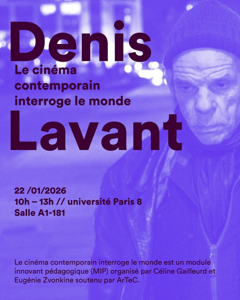 Le cinéma contemporain interroge le monde est un module innovant pédagogique (MIP) organisé par Céline Gailleurd et Eugénie Zvonkine (Paris 8), ouvert aux étudiant·es du master cinéma parcours Réalisation et création de Paris 8 et du master ArTeC. Cette année, les étudiant·es et enseignantes recevront Denis Lavant le 22 janvier à l’université Paris 8.