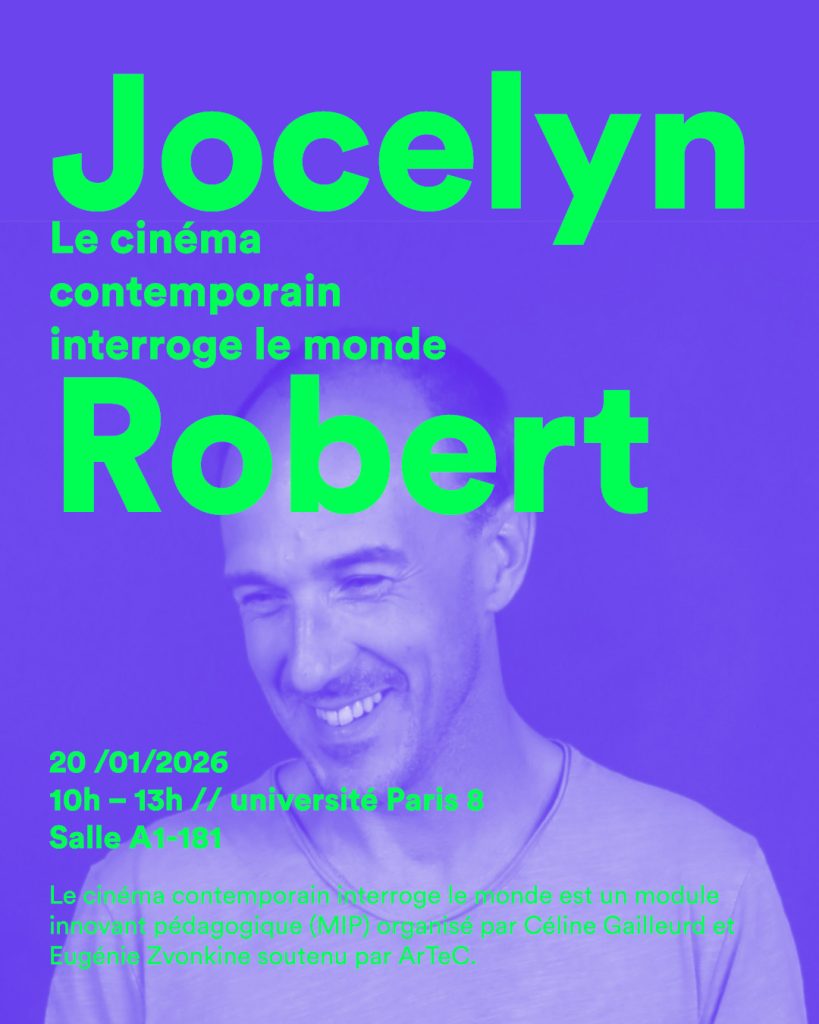 Le cinéma contemporain interroge le monde est un module innovant pédagogique (MIP) organisé par Céline Gailleurd et Eugénie Zvonkine (Paris 8), ouvert aux étudiant·es du master cinéma parcours Réalisation et création de Paris 8 et du master ArTeC. Cette année, les étudiant·es et enseignantes recevront le 21 janvier, Jocelyn Robert monteur son mixeur à l’université Paris 8.