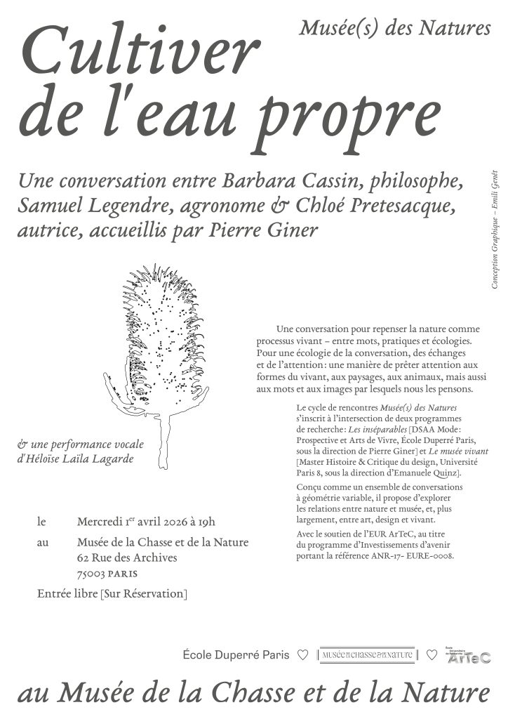C’est à partir de cette expérience, de nos mots et face aux maux du monde, que s’ouvre le séminaire Musée(s) des natures. La conférence inaugurale, intitulée Cultiver de l’eau propre, prendra la forme d’une conversation entre trois expériences du monde : celle de la philosophe Barbara Cassin, attentive aux mots, aux traductions et aux concepts, celle de son fils Samuel Legendre, agronome, engagé dans les pratiques concrètes de la terre et de l’eau, et de sa nièce Chloé Pretesacque autrice du livre Failles et fuites : Sourcellerie précapitaliste et radiesthésie moderne.