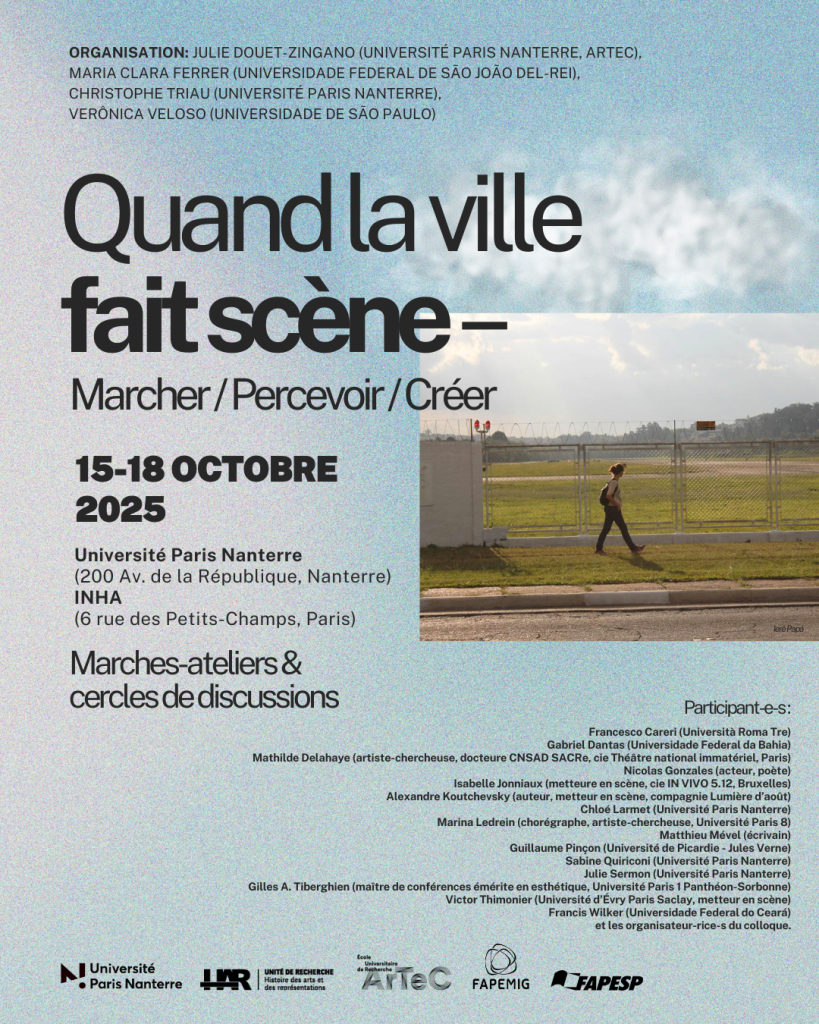 Quand la ville fait scène – Marcher / Percevoir / Créer ouvre un cycle d’événements de recherche-création dédié aux pratiques de la perception en milieu urbain. Pendant trois jours, artistes, enseignant-e-s-chercheur-se-s et étudiant-e-s en arts se réuniront autour d’activités pratiques et théoriques, visant à interroger nos manières d’expérimenter la ville. L’objectif est de percevoir comment la ville se fait présente à nos yeux et, plus largement, à tous nos sens, afin de transformer l’expérience urbaine en un motif et en un moteur de création. En explorant les rues, ponts et places de Nanterre et Paris, nous chercherons à redécouvrir ce que nous avons tendance à regarder sans voir, à écouter sans entendre, pour saisir les présences qui nous entourent et laisser émerger les récits enfouis.