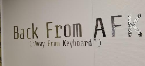 Back from AFK (away from keyboard), exposition présentée en juin 2022 à Poush Manifesto dans le cadre du Diplôme interuniversitaire ArTeC+ sous le commissariat d’exposition d’Hortense Boulais-Ifrène et Loréna Lisembard invite à célébrer le trouble de nos quotidiens suspendus entre virtuel et actuel. Le long des routes bétonnées ou des couloirs d’un bureau qui nous semblent vaguement familiers, dans les mondes virtuels, nous fabriquons aussi du quotidien. Back from AFK (away from keyboard), met en relief des vernis perceptifs qui se superposent à l’infini dans un va-et-vient sans début ni fin, puisque tout est IRL (in real life).